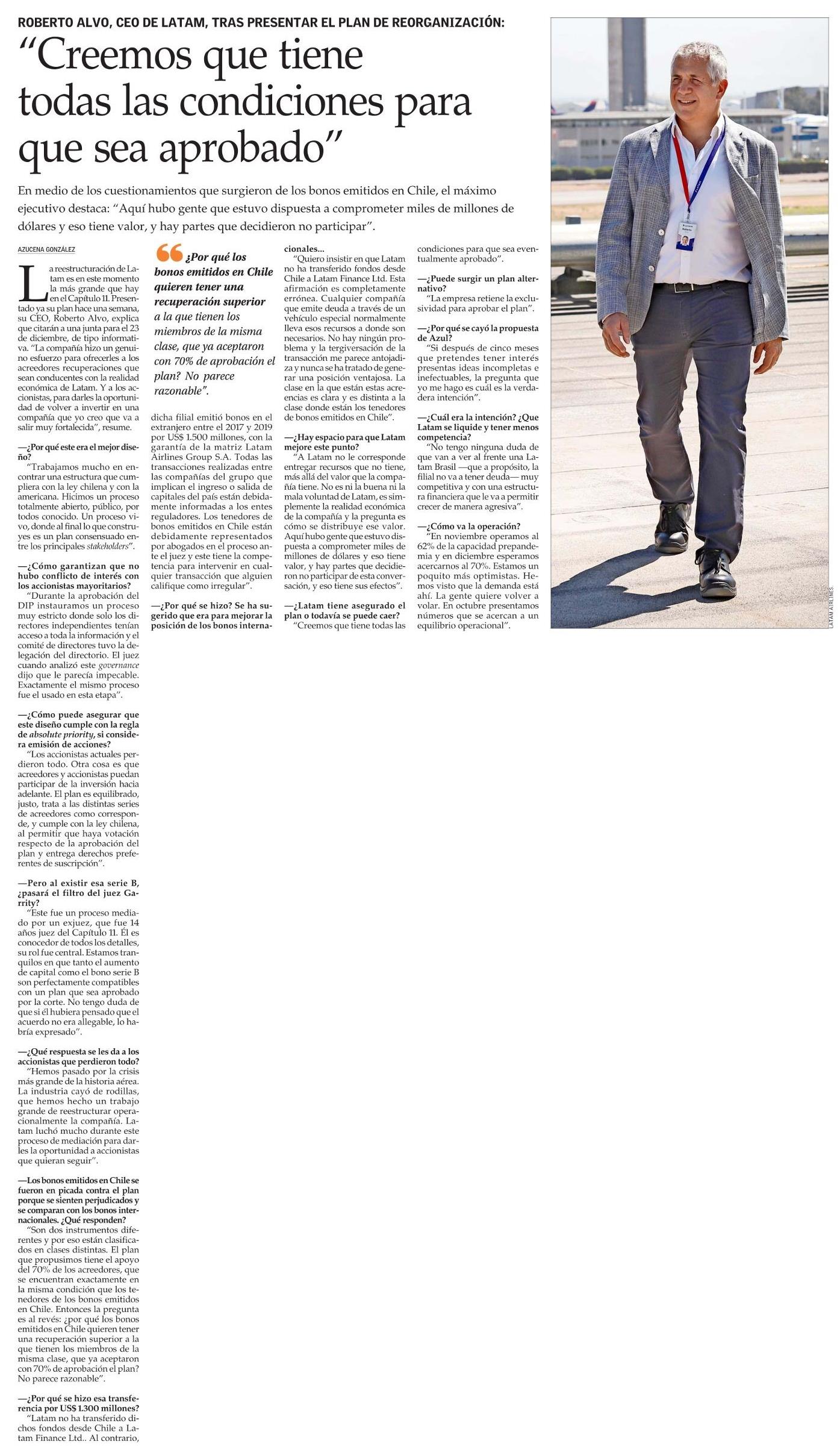 Roberto Alvo, CEO de Latam: "The plan is beneficial for all stakeholders" Dezembro 4, 2021 Fonte La Tercera